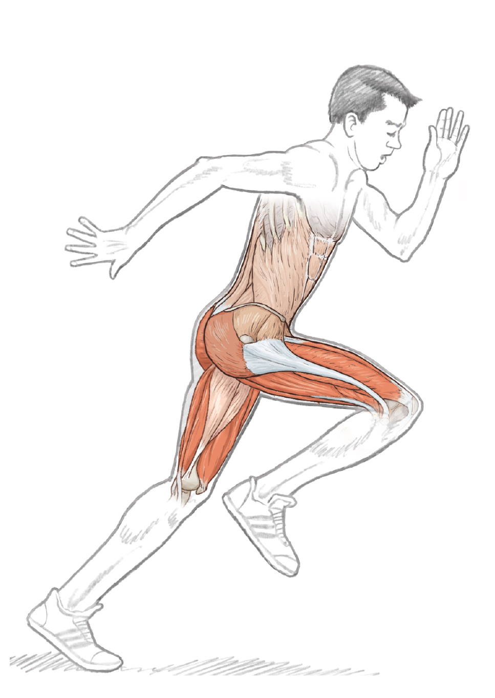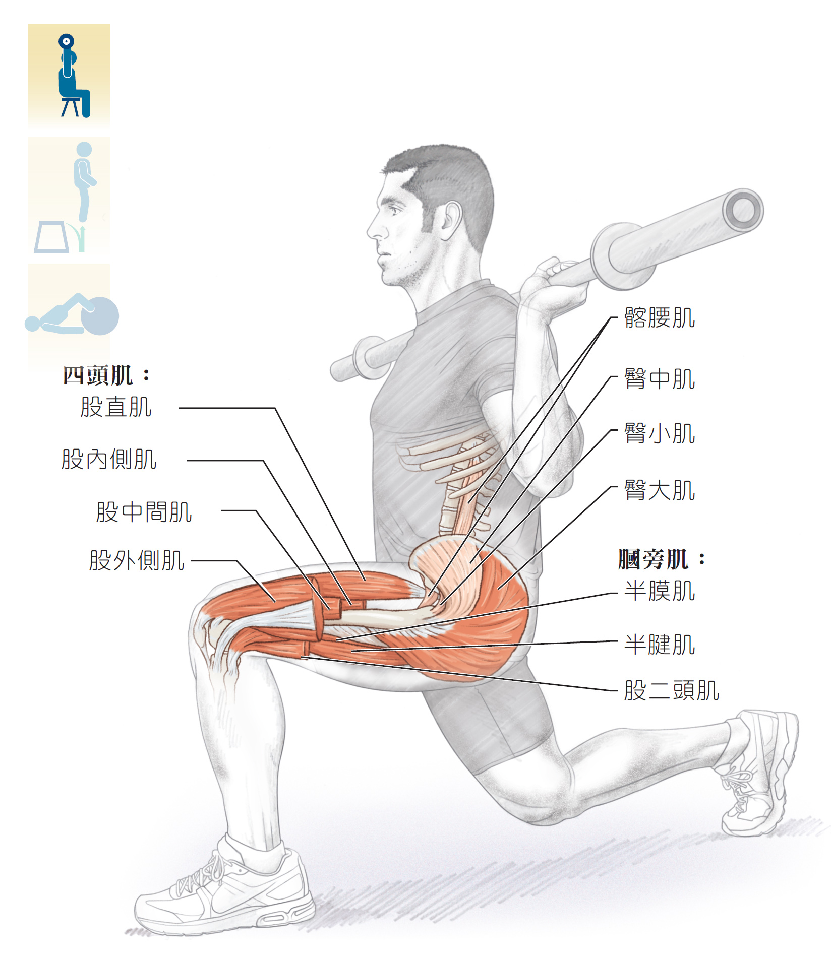 - 主要:臀大肌、膕旁肌(半腱肌、半膜肌、股二頭肌)、四頭肌(股直肌、股外側肌、股內側肌、股中間肌)