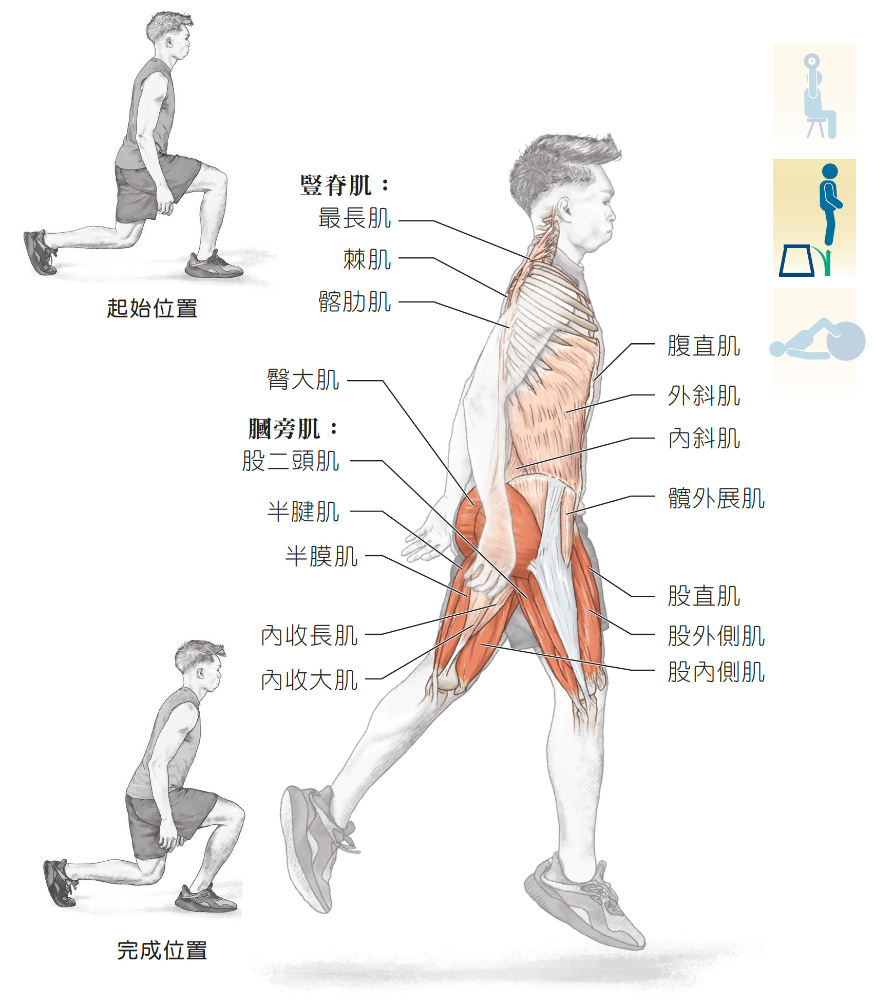 - 次要:髖外展肌、髖內收肌(內收長肌、內收大肌、內收短肌)、豎脊肌(髂肋肌、最長肌、棘肌)、腹直肌、內外斜肌、腹橫肌