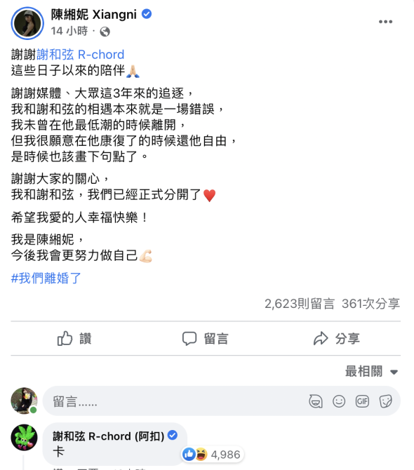 不過莉婭單方面宣布離婚,謝和弦就在留言處留下「卡」一個字,讓人看得一頭霧水,直到今(8)日凌晨他才在臉書發文:「私訊報名下一任謝太太。」似乎是間接認了離婚。