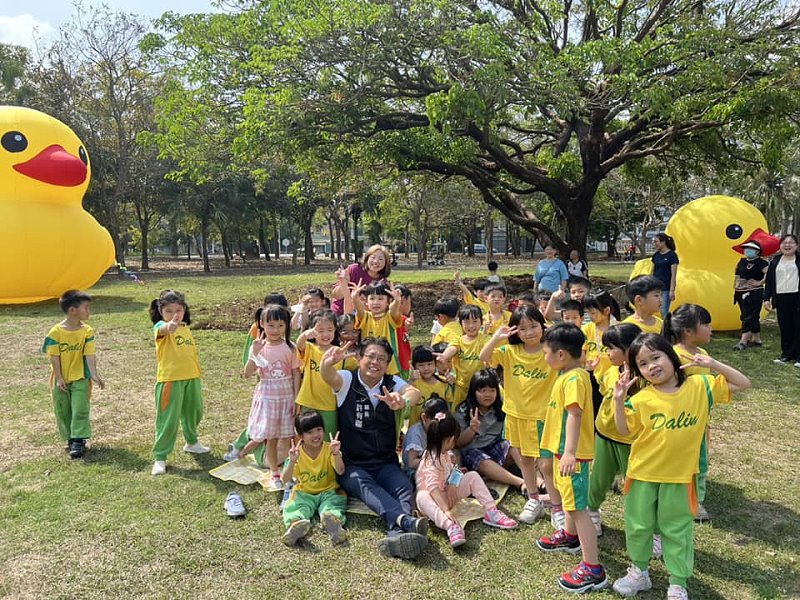 而早在幾天前,民眾已在議論紛紛「大林也有黃色小鴨?」大林鎮長許有疆在今年兒童節特別策畫送給鎮民一個大驚喜,就是高達5公尺的一家三口黃色小鴨快閃出現在運動綠廊,鴨爸爸和鴨媽媽帶著鴨寶寶一起來參加草地派對活動,吸引眾多小朋友來和小鴨拍照;許鎮長說,黃色小鴨非常療癒,為了讓鄉親可以就近看到小鴨,不用再大老遠跑到高雄,因此與公所團隊籌畫讓黃色小鴨進駐大林。