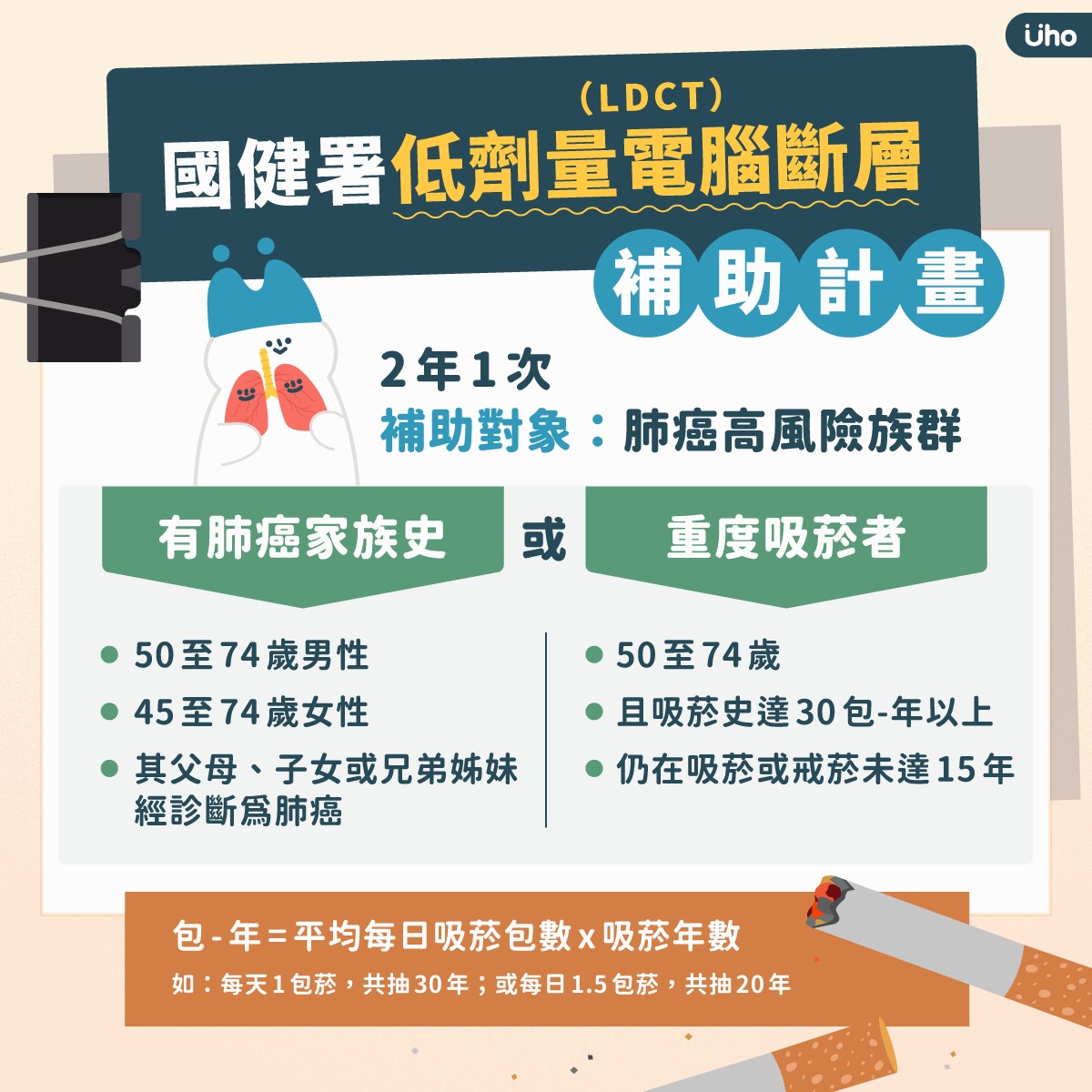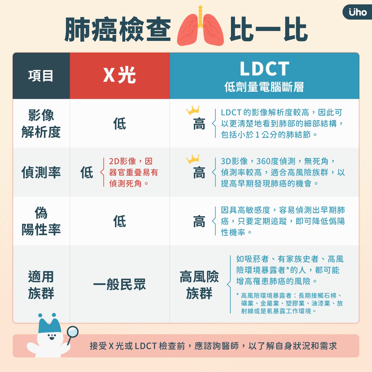 早期篩檢不僅能提早抓出肺癌病兆,同時手術效果也較佳,不過,常規X光對於1公分以內的腫瘤敏感度不足,為避免此特性致使病灶沒有被發現,國健署推行的「低劑量電腦斷層(LDCT)」篩檢,是目前國際公認最精準有效的肺癌檢測儀器,小於1公分的結節都能被照得清清楚楚,更不會因為病灶被骨骼或器官遮擋而無法偵測到,因此他也建議40歲以上民眾,若自身經濟許可,可以將LDCT列入定期健檢項目。