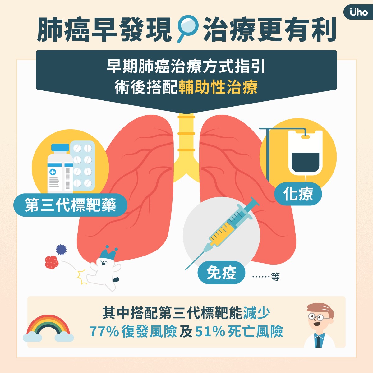 最後他也呼籲,肺癌幾乎已經是台灣人的新國病,不管是否為高風險族群,都建議能夠將低劑量電腦斷層(LDCT)作為40歲以上族群健檢的項目之一,針對高風險族群之民眾國健署也給予篩檢補助,如果是早期肺癌病患,特別是帶有EGFR基因突變的個案,現今研究指出,在術後以第三代標靶藥物輔助治療,對存活率有相當好的效果,建議患者與主治醫師討論治療計畫,如果能將疾病控制好,享有更長的存活期,對生活品質與心理壓力都會有很好的幫助。