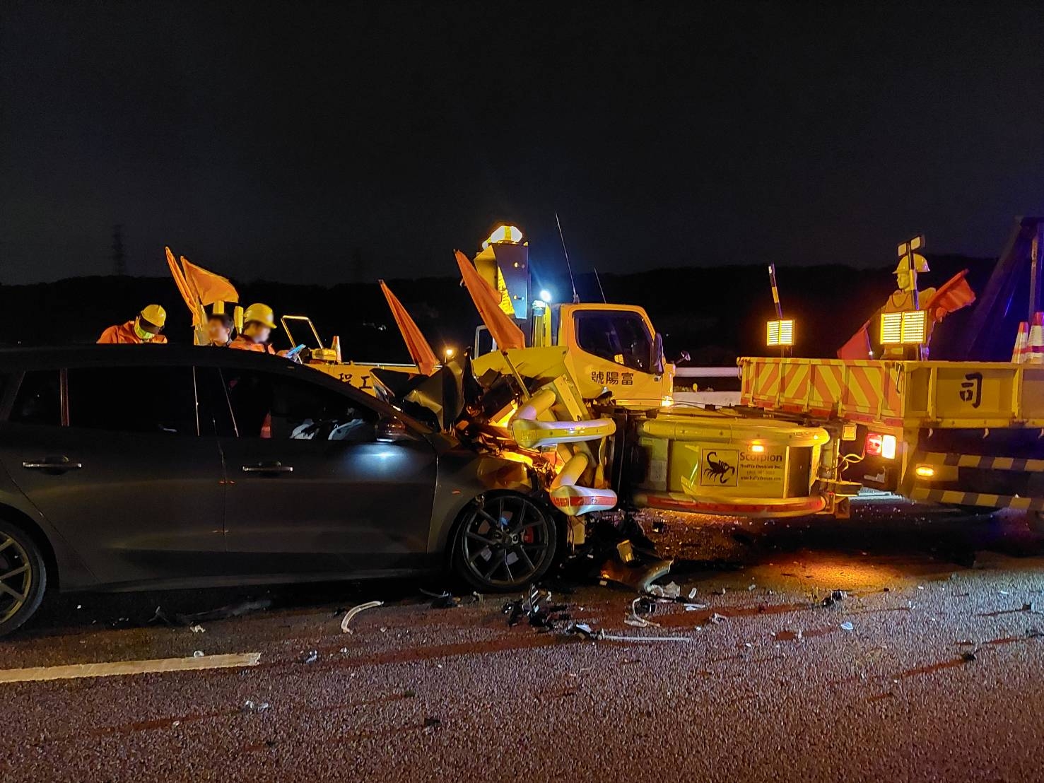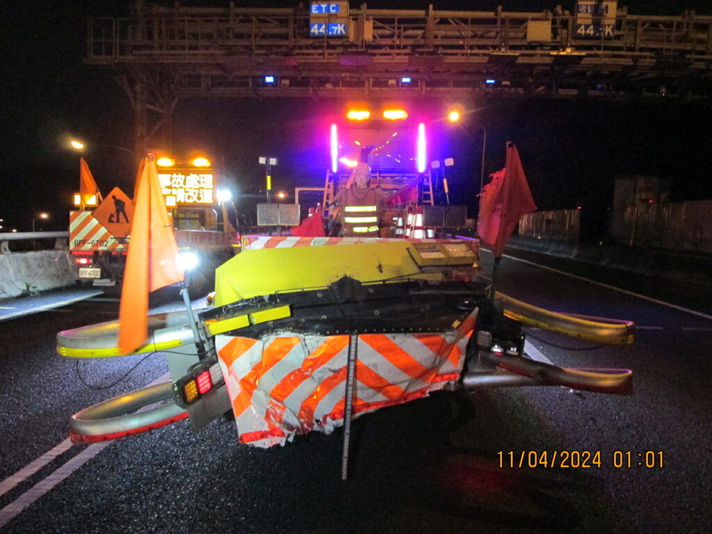 員警於0時28分到場處理,本局緩撞車及高公局緩撞車、工務段警戒車2部隨後抵達警戒布設交維措施,現場占用高乘載車道及內側車道處理,消防車1部、救護車2部陸續抵達現場救援傷者。0時51分後方一部由41歲王姓男子駕駛的小客車行駛於內側車道,疑似未注意前方動態追撞擔任警戒的國道警緩撞車,幸賴緩撞設施將王男車輛擋下,現場無人受傷。