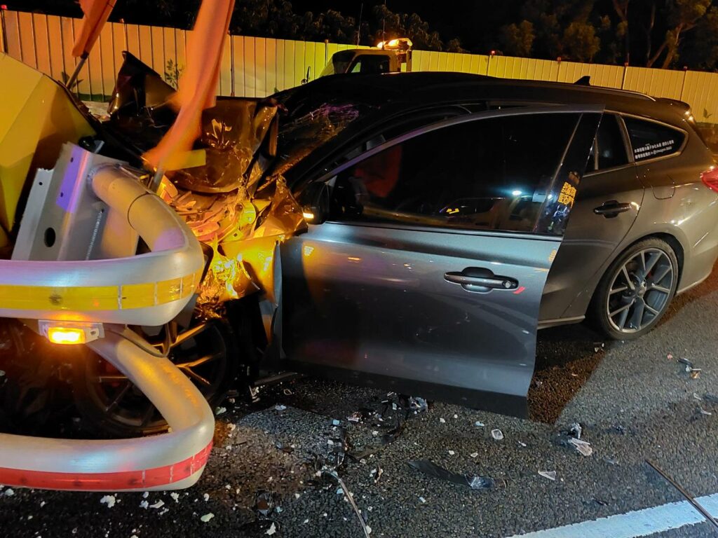 【記者爆料網 周庭慶/桃園報導】國道1號五楊高架路段11日凌晨發生事故,現場還在處理時,1輛自小客車未注意前方路況不斷逼近事故現場,結果撞上緩撞車,報好有緩撞車擋著,處理事故的警消、事故當事人、拖吊車司機及工務段警戒人員等將近20人無人受傷,自小客車駕駛也因緩撞設施吸收強大撞擊力道未受傷。