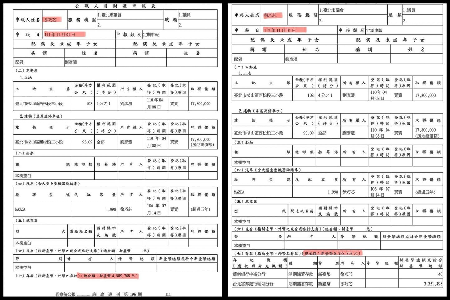民進黨新北市議員李宇翔17日上政論節目《台灣向前行》時,拿出徐巧芯夫婦的財產申報證明表示,「(民國)111年的1月,當時徐巧芯申報,她跟她先生總共的存款有大概458萬元,但在短短一年的時間,到了(民國)112年,徐巧芯夫婦的存款暴增到了873萬元,這個累積是蠻大的」。