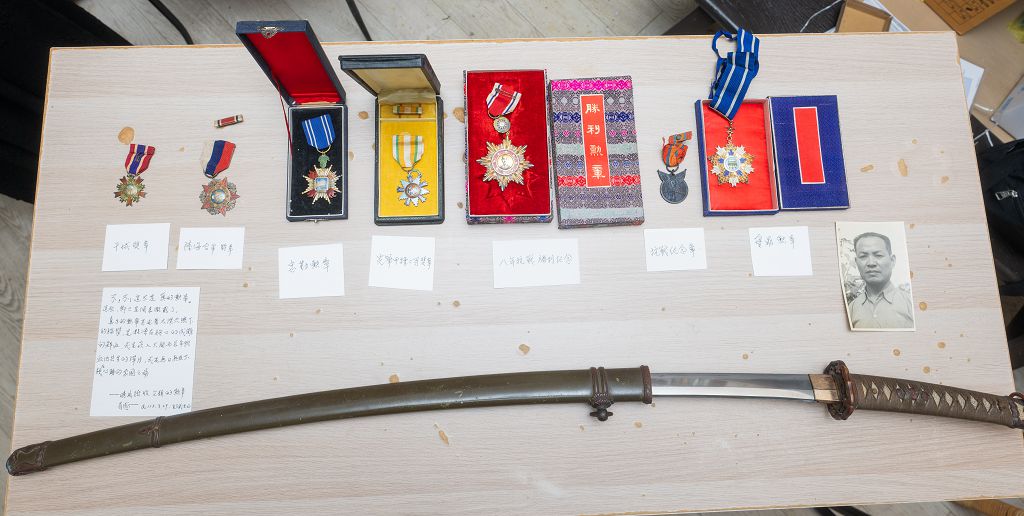 擺放在桌上的,是一把插在古銅色刀鞘內、外觀質樸、長逾一公尺的日本武士刀。以及一枚枚象徵當年戰功卓著、為國貢獻的紀念勳章。其中有抗戰勝利勳章、寶鼎勳章、忠勤勳章、干城勳章等。這些,都是知名作家張曉風教授的父親──張家閑將軍的遺物。