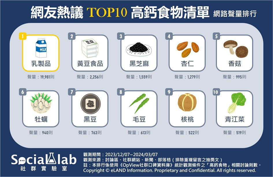 《Social Lab社群實驗室》本次透過《OpView社群口碑資料庫》追蹤近3個月內「高鈣食物」話題的網路聲量表現,帶您了解網友熱議的高鈣食物聲量排行。