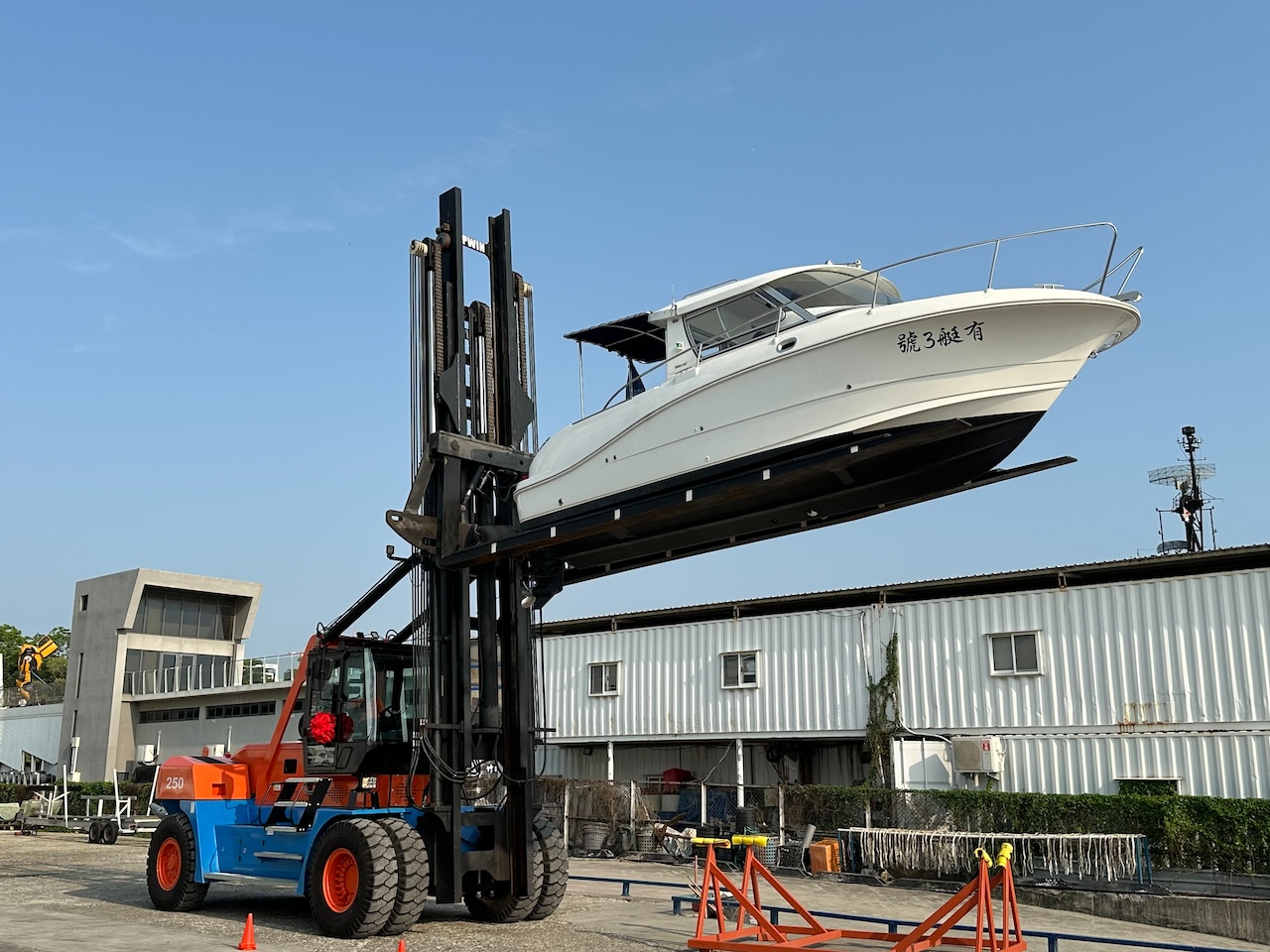 該船舶堆高機係「南台灣唯一」的一部,採用液壓系統及穩定的支撐結構,可乘載20噸以內的船隻,相當於一輛公車的重量。同時,相較斜坡道使用拖車移動船隻,以堆高機將船艇上下架的方式,更為安全可靠,船主們可安心上架船隻,這也為安平港區的遊艇搬運引進全新的模式。