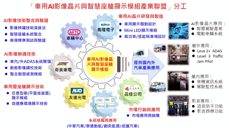 ▲車用AI影像晶片與智慧座艙顯示模組產業聯盟分工圖。(圖/車輛中心提供)