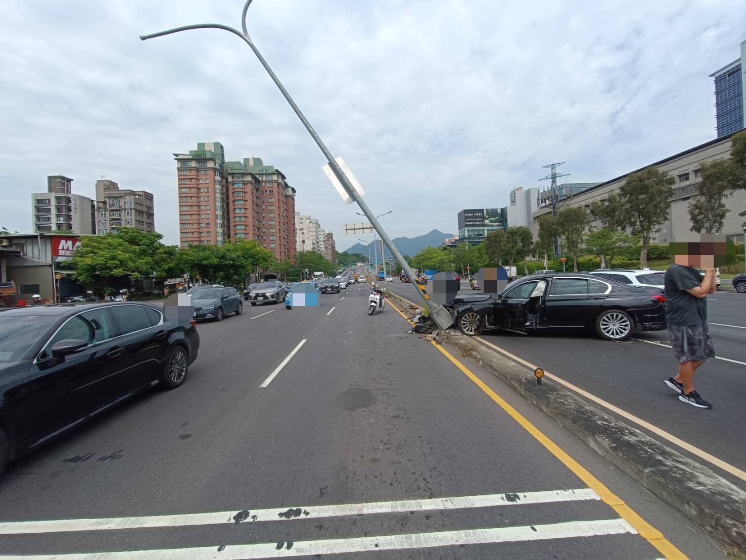▲轎車偏移撞擊電線燈桿。(翻攝畫面)據了解,年約69歲的高姓女駕駛,當時開著駕駛自小客車沿著北投區大度路由東往西,朝淡水方向行駛,忽然之間車頭偏移,直接撞上分隔島上的電線桿,導致電桿歪斜,差點倒下,車輛也打橫卡在道路中間。而後方的40歲謝姓男駕駛,閃避不及,又撞上高姓女子的左後車尾。