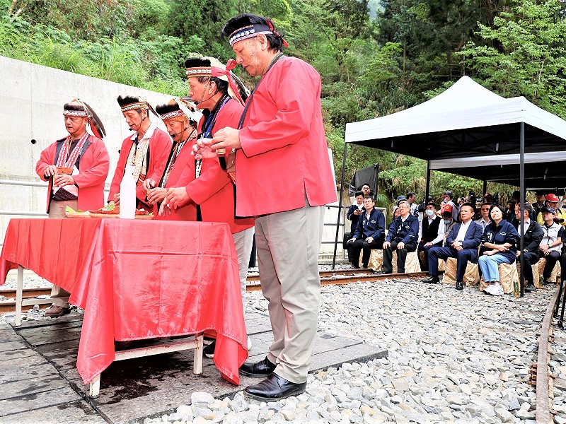 典禮開始前,祈福儀式由鄒族特富野社汪義福頭目、鄒族特富野社陳明川長老、石明華長老、高德生長老及來吉部落梁崇效前主席面向隧道洞口的東方,誠心用鄒族母語向山神說明工程已經順利完工即將恢復行駛…,過程中邀請大家一起舉杯向山神敬酒,並與來賓分享豬肉、小米酒、糯米年糕等祭祀用品,祈求保佑林鐵火車出入安全,一路順隧。