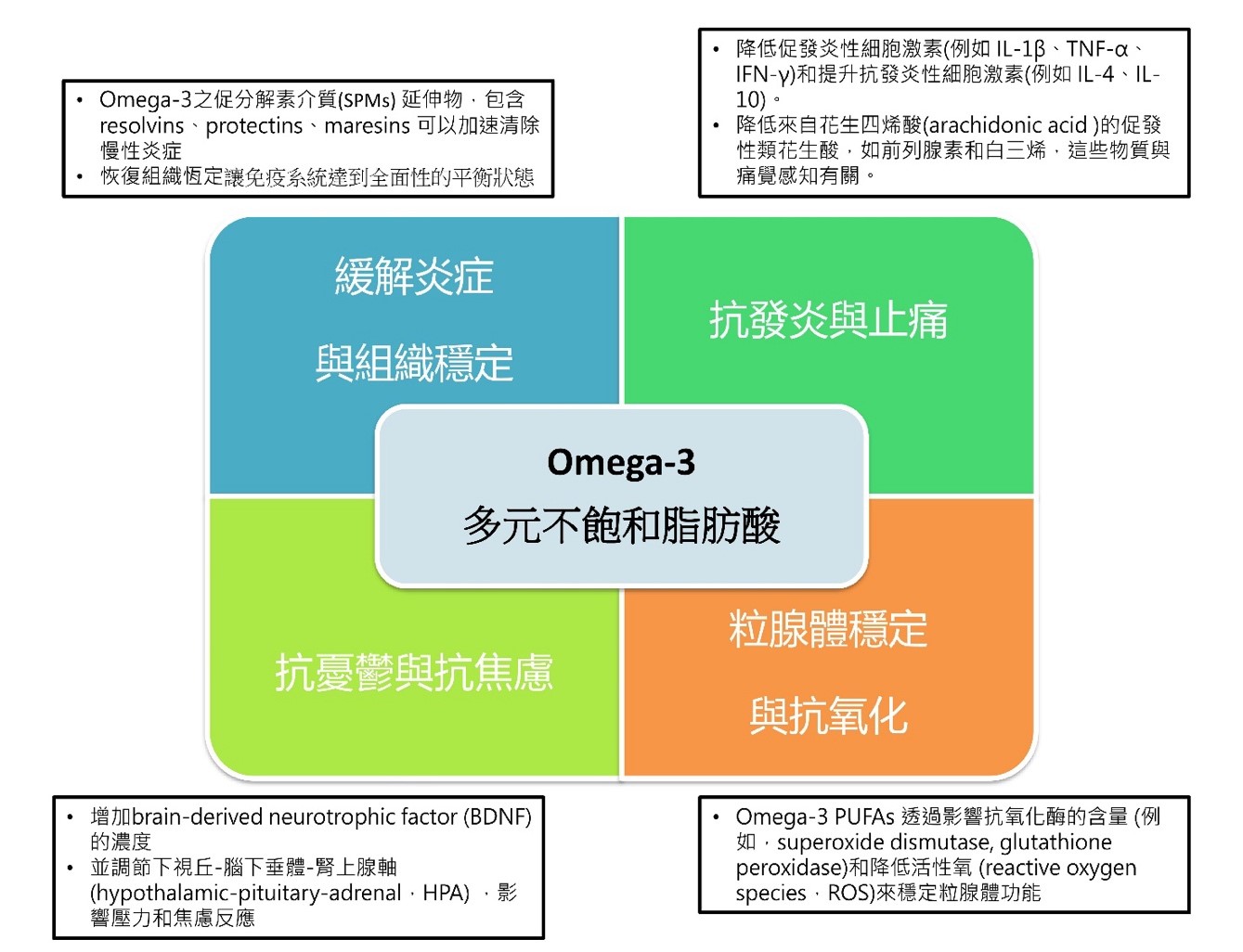 安南醫院副院長蘇冠賓教授則認為,Omega-3 中的多元不飽和脂肪酸 (Omega-3 or n-3 PUFAs),特別是二十碳五烯酸Eicosapentaenoic Acid (EPA),具有抗發炎、抗氧化、調節神經傳遞物質等多種功效。近年來,蘇冠賓教授在領導中國醫藥大學身心介面研究中心的團隊,執行多項臨床試驗和轉譯研究,發現EPA對憂鬱症、疼痛、心臟血管疾病和神經退化性疾病,具有安全性高的保健功效。