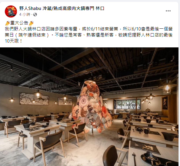 翻攝自野人Shabu 冷藏/熟成高級肉火鍋專門 林口野人火鍋林口店發文指出,因諸多因素考量,將於6/11結束營業,所以6/10會是最後一個營業日(端午連假結束),並強調會盡力確保客人都能享受到所有品項。
