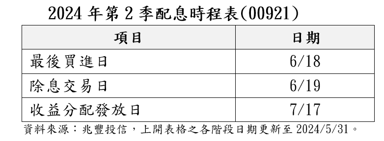 兆豐龍頭等權重(00921)要配息囉,兆豐投信初估每單位配發0.58元,是00921成立以來最高配息水準,將於6月19日除息,想要參與除息的投資人,最後買進日6月18日,收益配發日為7月17日。
