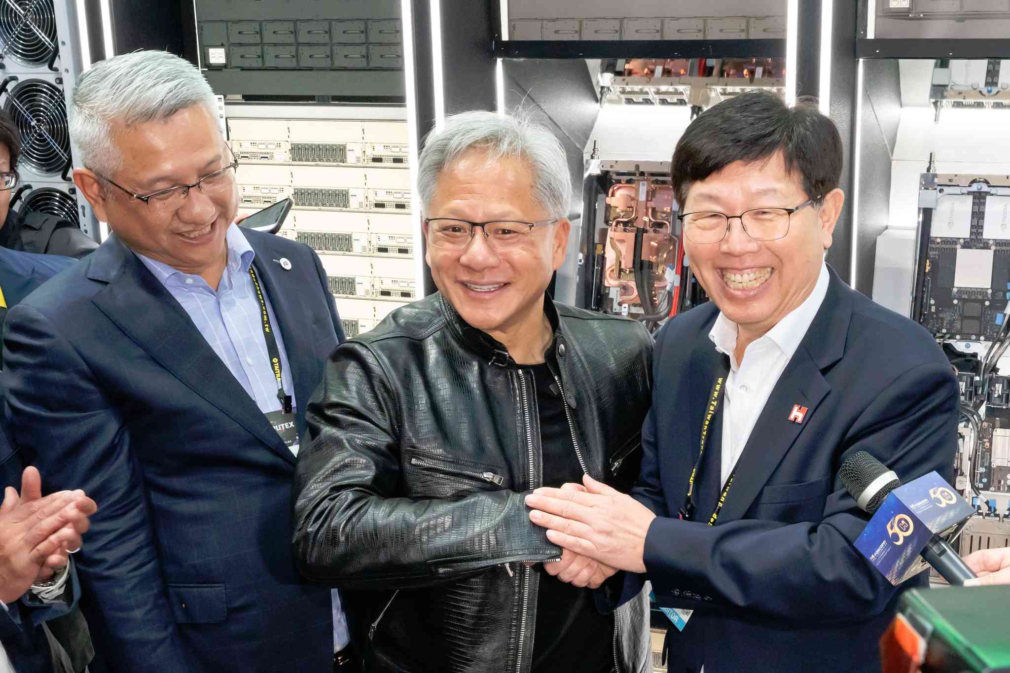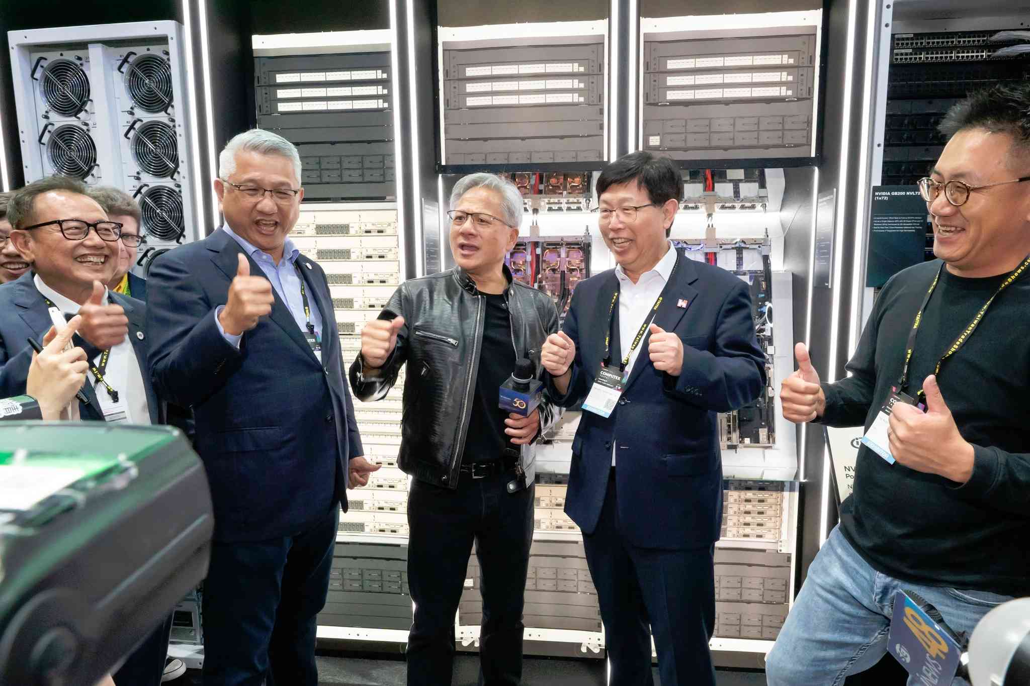 輝達執行長黃仁勳週二(4四)上午現身台北國際電腦展(COMPUTEX 2024),與鴻海董事長劉揚偉合體參觀鴻海旗下「鴻佰(Ingrasys)」展區,鴻佰主要為輝達代工組裝GB200 NVL72、MGX以及HGX等AI伺服器。劉揚偉親自帶領現場鴻海集團主管,連三聲高喊黃仁勳的英文名「Jensen」,現場氣氛歡騰。