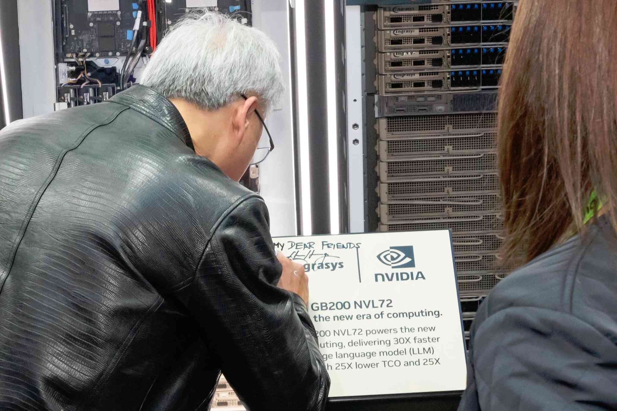 黃仁勳親自到訪鴻海旗下「鴻佰科技」展位,除了參觀雙方合作的GB200 NVL72、MGX及HGX等相關產品,最後也在機櫃上簽名留念。圖片來源:鴻海