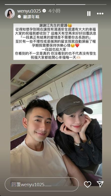 無名女神「小予」陳玟予宣布懷孕。(圖/翻攝陳玟予IG)不過有網友指出,她與前一任男友2月才分手,如今宣布懷孕,網友發現男方並非過去交往的對象,引發外界討論。而她回應:「謝謝江先生的愛護,從得知懷孕到現在我有滿滿的安全感,還有大大的幸福,大家的祝福我都收到了,這幾天有空再來好好回覆訊息,『一段真正有結果的愛情是不需要你去長跑的』,至於有一些不理性或是揣測的留言,我就自動屏蔽了喔,孕期我需要保持快樂心情,一段話也給大家:你看到的不一定是真的,你沒看到的也不代表沒有發生,祝福大家都能開心幸福每一天。」