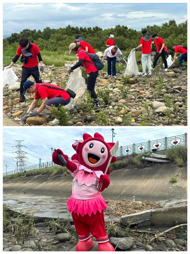 13日台中大遠百參與淨灘的人,全員穿上紅色POLO衫,遠百吉祥物花寶寶也化身為淨灘環保小尖兵,動手清除廢棄物;其中,撿拾最多的垃圾是塑膠類製品。
