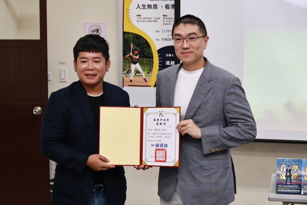 基隆市政府教育處6月15日在信義國中辦理「運動生涯發展講座」,邀請前中華職棒秘書長馮勝賢擔任主講,分享自己的生命故事,市長謝國樑也到場向馮勝賢致意,並送給參加的同學馮勝賢秘書長著作的《看準就撲》,鼓勵學子勇於面對失敗、不服輸繼續前行,做最好的自己。