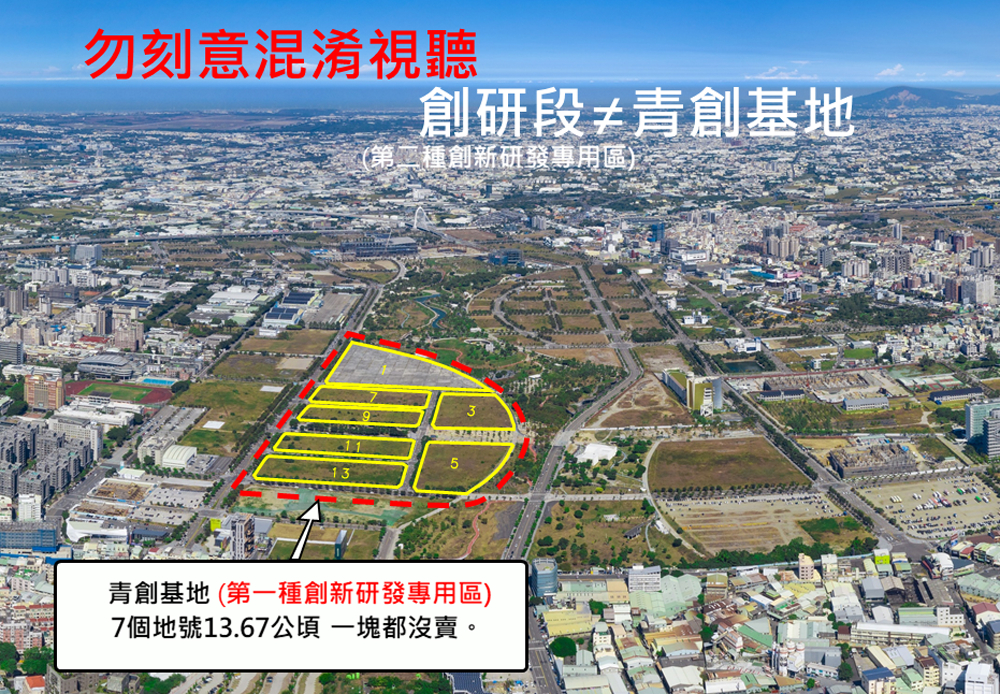 台中市政府澄清,台中市政府2019年公開標售創研段2、3、6、7地號等4筆土地,使用分區屬於創研二,容許做為連棟住宅、集合住宅、商務住宅、學前教育設施、社區遊憩設施、醫療保健設施、社會福利設施、辦公室事務所及工商服務業等類別使用,根本不屬於「青創園區」的範圍,標售所得價金也將全數償還開發債務,以降低台中市政府的利息負擔。