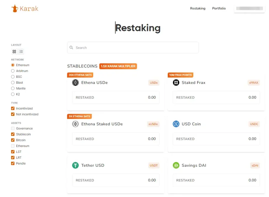 與 Eigenlayer 不同的是,Karak 旨在支持任何資產都能進行再質押,目前平台上支持的再質押資產包括 ETH 、各類 LST 和 LRT 資產、還有 USDT 、 USDC 、 DAI 、 USDe 等穩定幣。