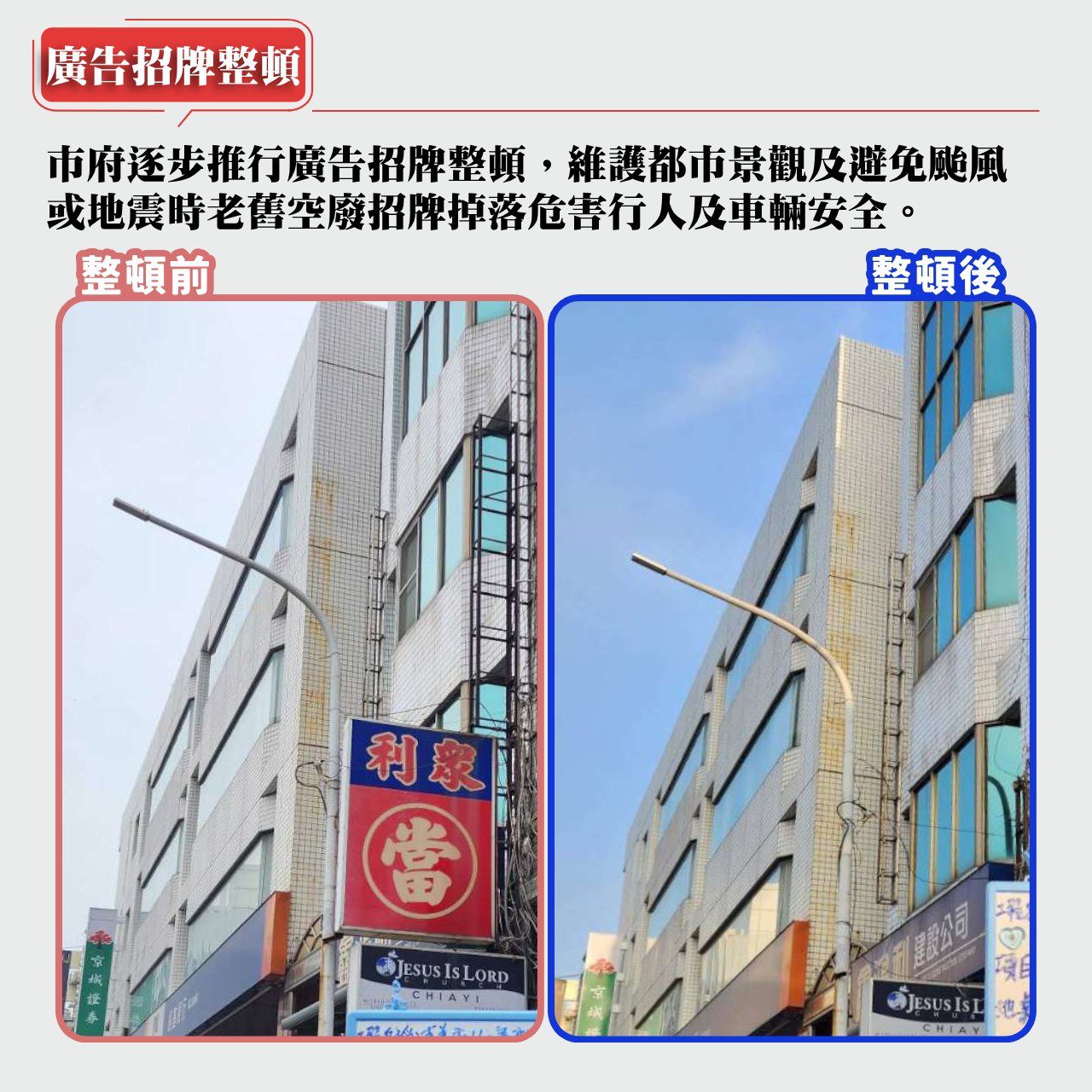 嘉義市府工務處已連續2年持續以街廓為單位,逐步推行廣告招牌整頓工作以改善市容景觀,今年上半年針對民族路段(民生北路至國華街)商店逐一訪談溝通,透過在地居民、商家共同參與推動招牌整頓達52面,市府協助改善店家招牌,同時也保留原店家招牌特色,大幅改善民族商圈市容,提升店家、商圈整體形象。