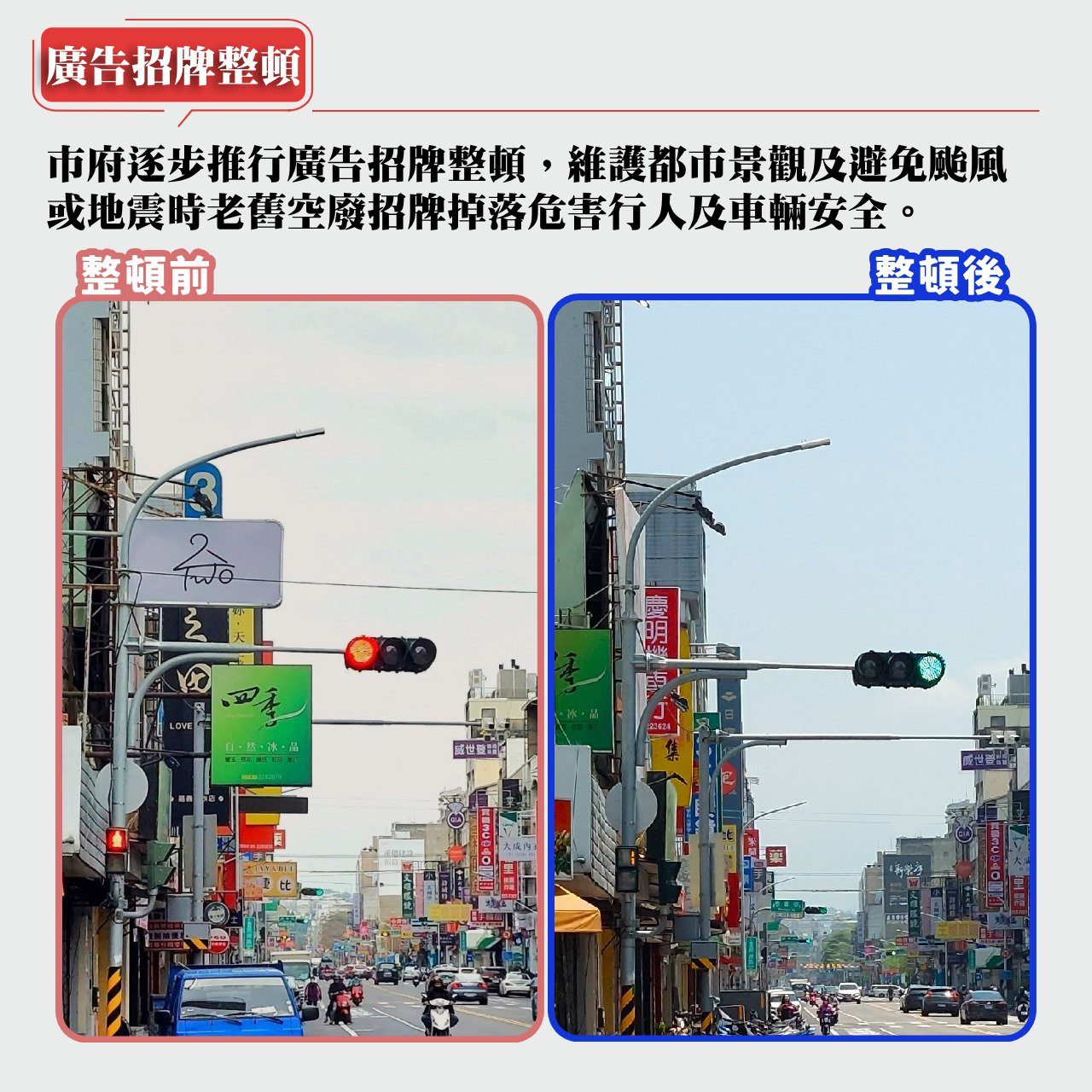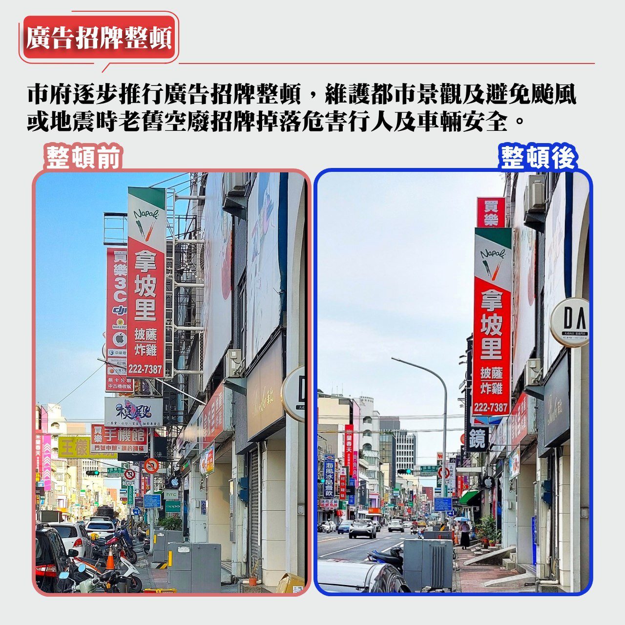工務處表示,未來市府將持續推動廣告招牌整頓,目前正持續往民族路段(文化路)進行溝通整頓,歡迎市民及在地店家踴躍參與,共同增進市容創造商機。