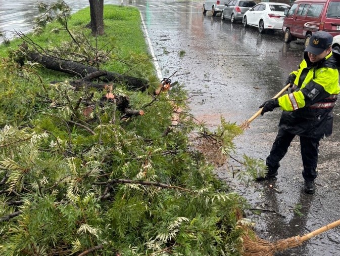 員警於現場擺放交通錐、拉設封鎖線實施交通管制,以提升民眾行車安全,並通報相關工程單位,員警擔心現場不立即處置迅速排除,將影響公共及行車安全危害,由於倒塌樹木太過沉重無法拖行,嚴重影響交通安全甚鉅,員警無畏風雨及車流危險揮汗與附近熱心民眾持電鋸將路樹支解,將樹木鋸成一段一段,以利移動粗壯樹幹。