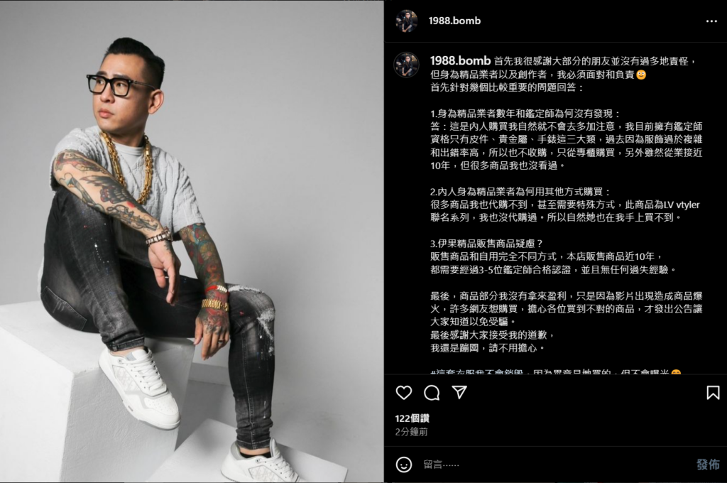 蹦闆二度道歉。(圖/翻攝蹦闆IG)蹦闆坦言,自己沒有代購名牌服飾,老婆自然就是從其他管道購得,尤其這次引發假貨爭議的套裝是LV vtyler 聯名系列,他自然沒有管道可以購買。對於大家最在意的自家精品店是否有商品真假不明的疑慮,蹦闆強調「販售商品和自用完全不同方式」。自家店面擁有3至5位鑑定師,必須經過重重檢驗,且過去10年中無任何過失經驗。因為拍片穿了這款衣服,導致許多網友跟風想購買,擔心更多人受騙才會決定說出:「最後感謝大家接受我的道歉,這套衣服我不會銷毀,因為畢竟是她買的,但不會曝光。」