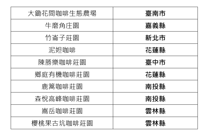 - 《年度南區咖啡莊園獎》:大鋤花間咖啡生態農場(郭雅聰)、締武咖啡農場(許鎧琳)。