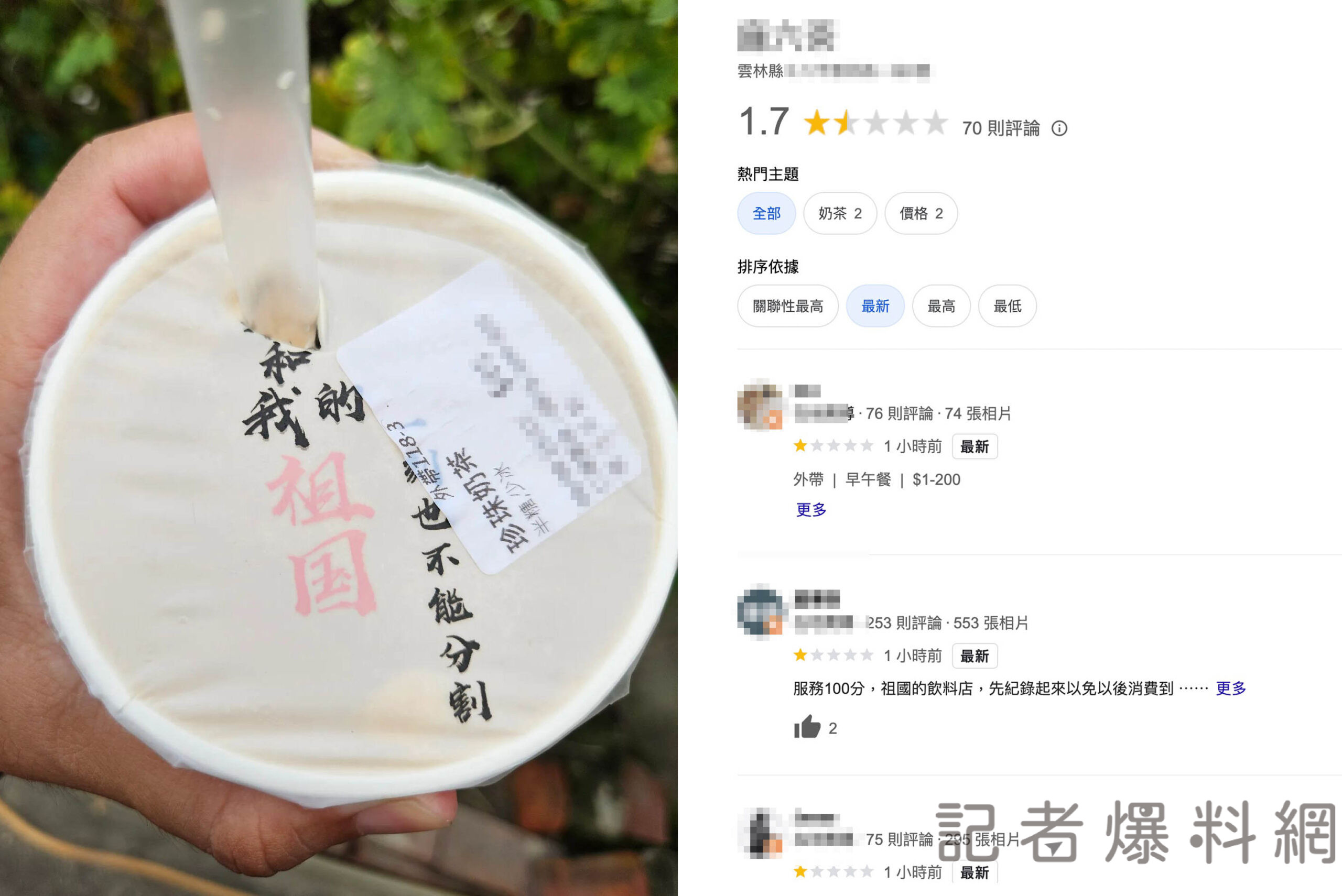 【記者爆料網 黃國瑞/雲林報導】一位民眾昨在雲林一家手搖茶店消費,封膜竟出現「我和祖國不能分割?!」統戰標語,網友群起炮轟,店家雖有道歉,但也遭網友無情狂洗1星評價。
