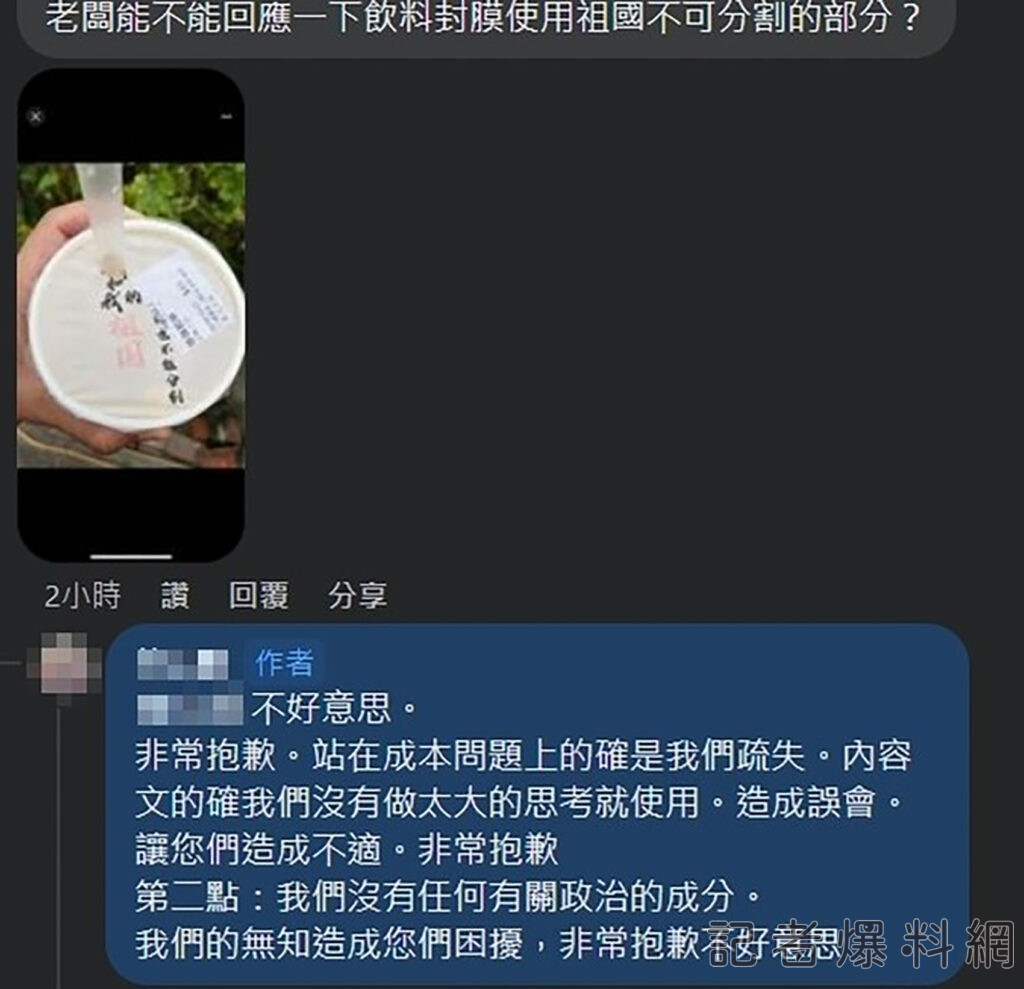 店家留言致歉。翻攝畫面網友對此狂轟,「使用不明來源的飲料封膜,有食安問題外,還有協助敵國外患的問題,非常噁心。」、「建議去祖國開」、「連個飲料封膜也要省…」、「好噁 不知道用的是什麼劣質材料」。