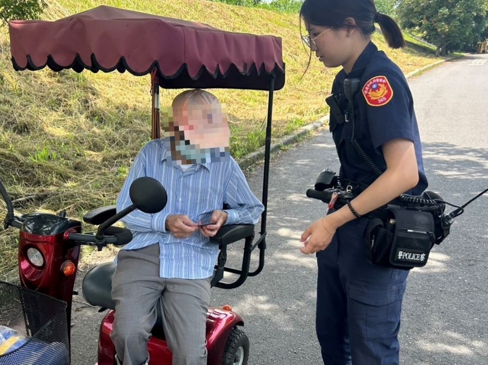 員警見狀便協助董翁將醫療代步車騎乘至董翁住家附近,另以巡邏車將董翁安全護送到家,以防董翁在炎熱的天氣下中暑。途中董翁不勝唏噓地嘆著「人老了,不中用了」、「連回家都要麻煩警察」,警方邊陪伴董翁聊天緩解其悶悶不樂的情緒、一邊安全將董翁及醫療代步車帶至住家附近,老翁見到平常熟悉的風景,終於展露笑容,向警方表達感謝之意。