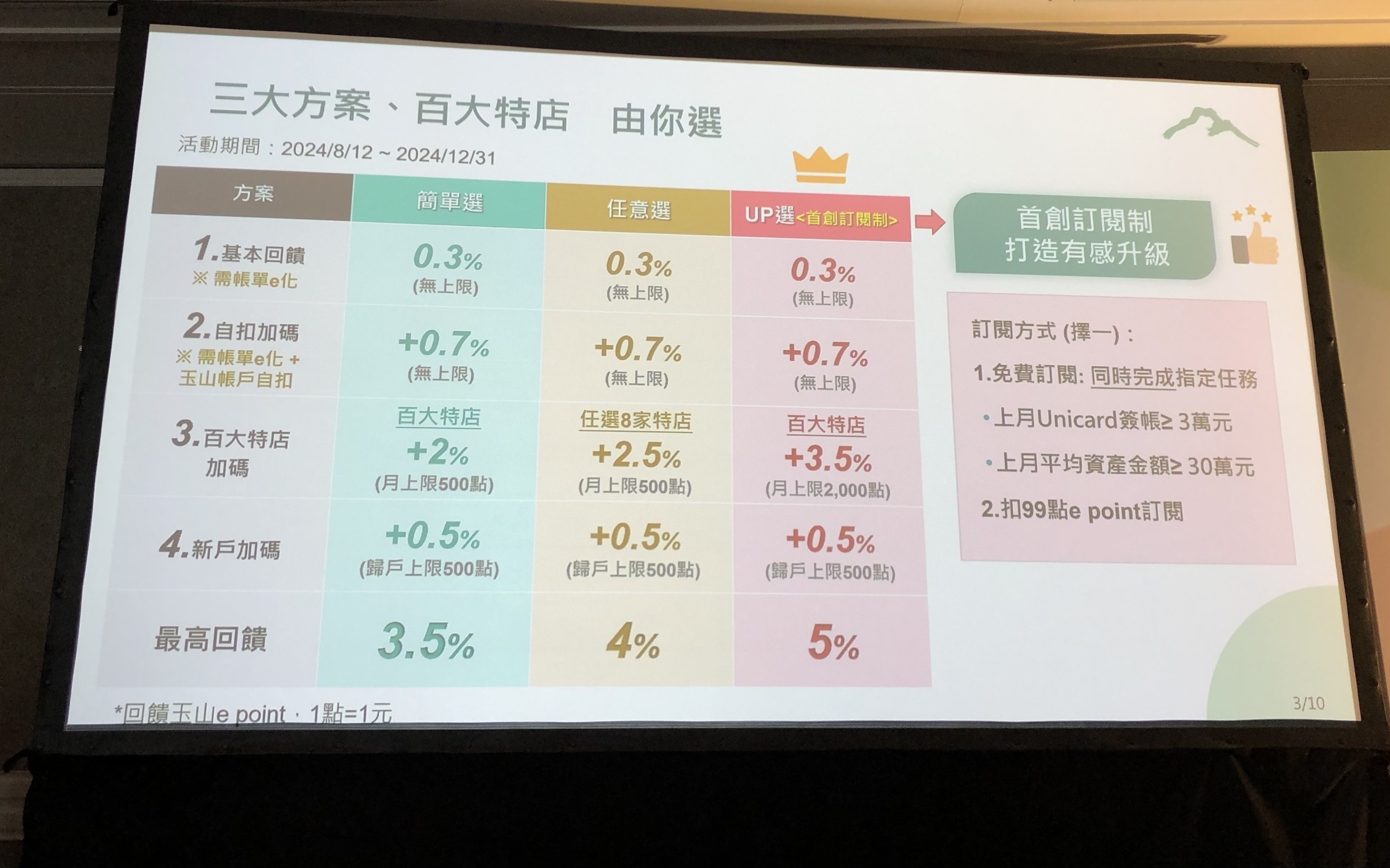 玉山銀全新推出「玉山Unicard」信用卡,強調三種回饋方案「由你選」,其中包含市場首創的訂閱制UP選方案,最高回饋5%,生活所需的百大特店,都在其中,讓卡友可以打造最適合自己需求的回饋。玉山銀還特別為這張卡片,推出e point點數回饋機制,1點=1元,發卡目標是百萬張,希望能成為玉山卡的主力卡。