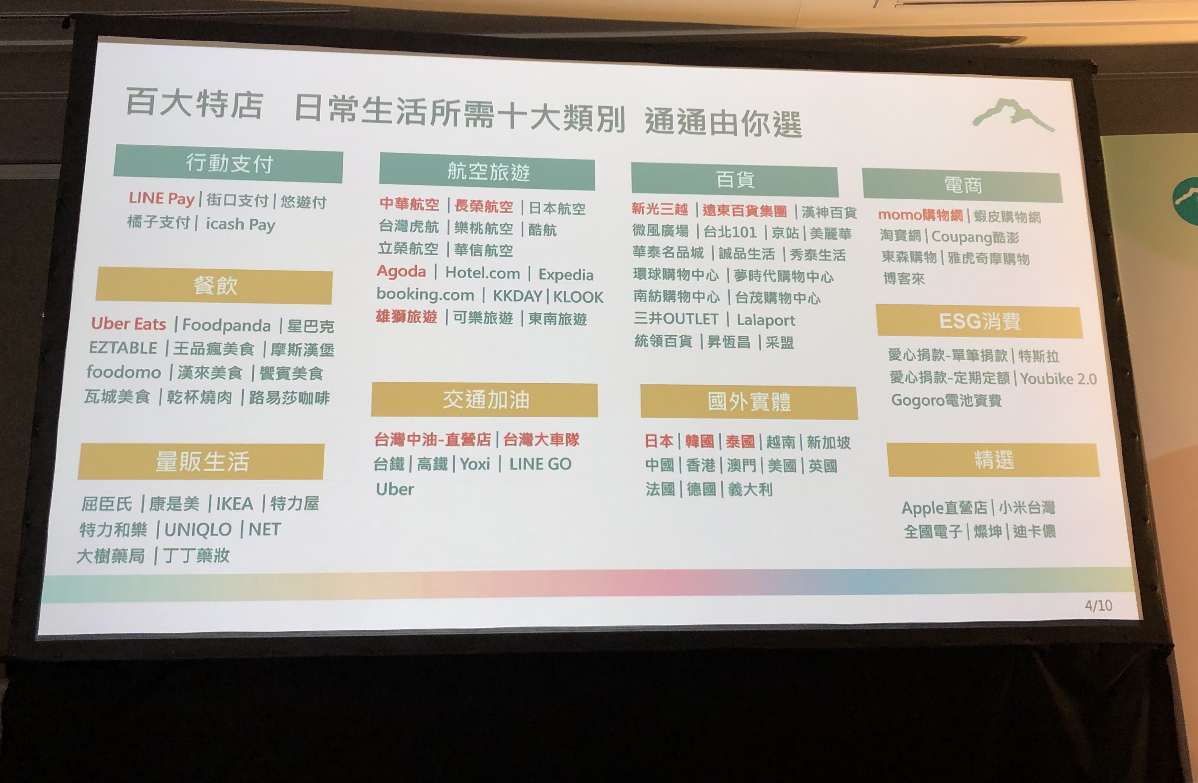 玉山銀目前精選了百家特店,包括10大類別、100間以上特店,如Line Pay、新光三越、momo購物網、Uber Eats、台灣中油直營加油站、雄獅旅遊、長榮航空、Agoda等,可說囊括了民眾經常消費的管道場域。(如下圖,記者李錦奇攝影)