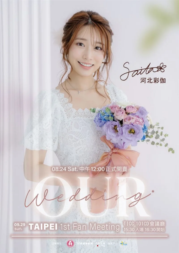 河北彩伽將首度來台舉辦見面會。(圖/勁維肯創意提供)河北彩伽將於9月29日下午舉行「河北彩伽 Our Wedding 粉絲見面會-台灣站」,活動以「Our Wedding」為主題,入場粉絲可幻想自己成為河北彩伽的新郎,進行多個遊戲及互動環節,還有機會跟女神有各式貼身接觸。更推出限量20名VVIP 粉絲更可於當日晚上跟河北共進晚宴,可近距離跟女神用餐以及專屬談心時刻,享受「老公」視角的沉浸式體驗!