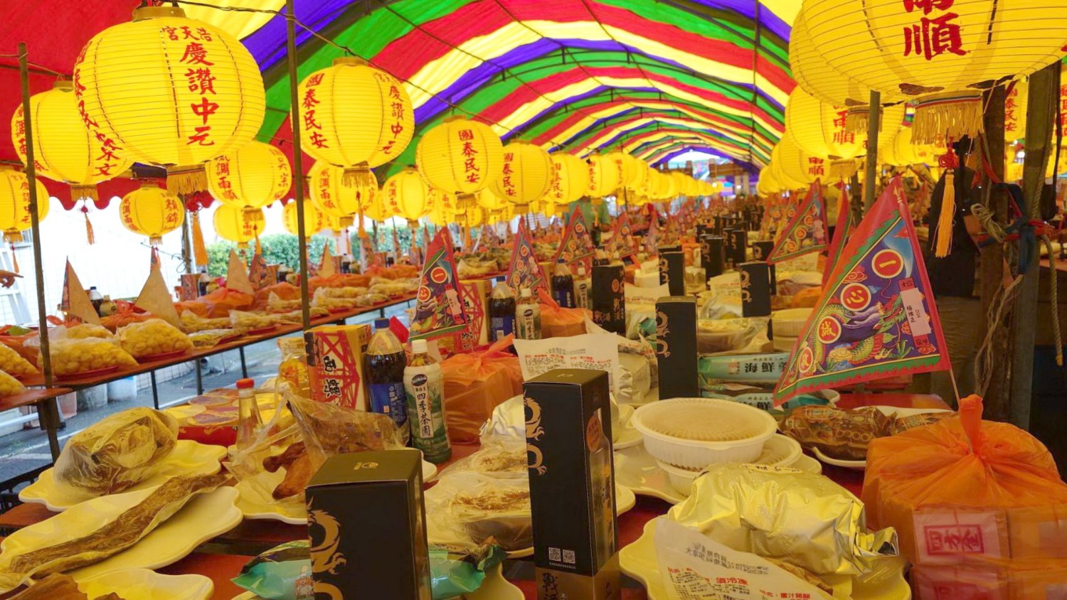 一年一度中元節,台中市梧棲區浩天宮今(18)日舉辦中元普度,現場供桌超過二千桌,場面十分盛大。除了鮮花素果、豬、雞、鴨、魚等牲禮、五穀餅乾、飲料、水果及麻將桌等供品,普度品中還出現「薑山鹽山」,廟方表示,「薑」代表「山珍」,「鹽」代表「海味」,復古傳承中帶著創意無限,十分特別。