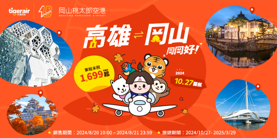 高雄-岡山航線開航初期,每週營運三班,去程航班編號IT262,每週一、五的中午12:50及每週三的上午10:55自高雄國際機場起飛;回程航班編號IT263,每週二的下午17:30及每週四、日的下午15:25自岡山桃太郎機場起飛。為慶祝新航線銷售,台灣虎航將於2024年8月20日上午10:00起至2024年8月21日晚間23:59推出單程未稅價的開賣促銷價,搭乘日期為2024年10月27日起至2025年3月29日止。此外,桃園出發的岡山航班也將從冬季班表開始,從每週七班增為每週九班,滿足市場的暢旺需求。