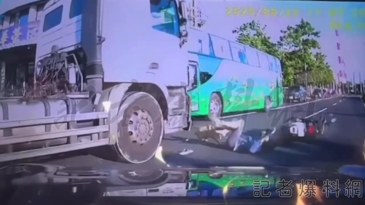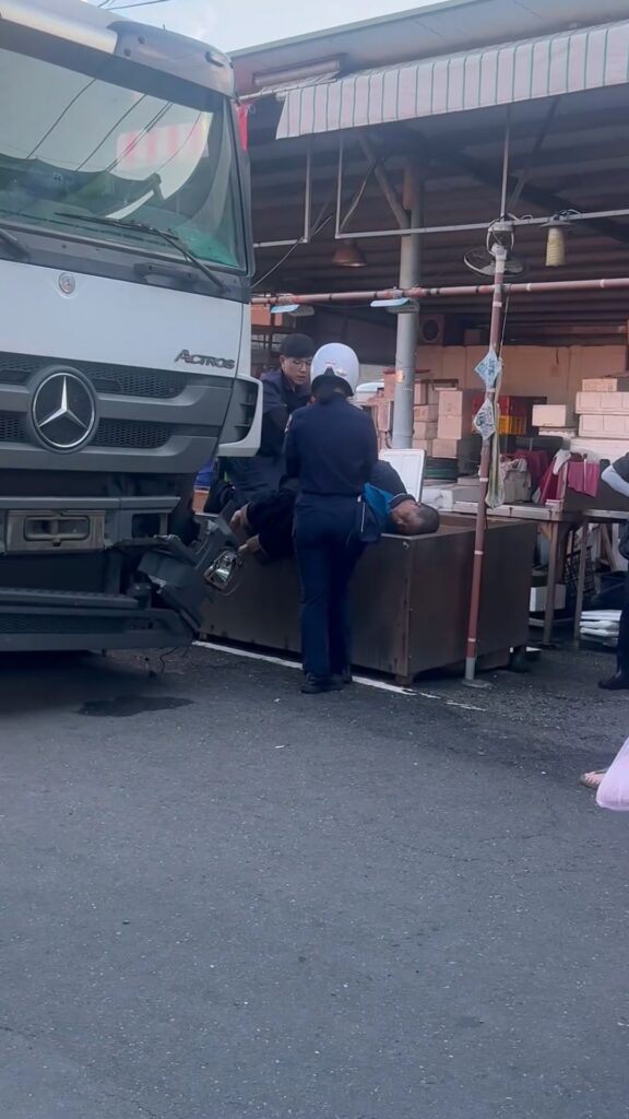 翻攝自Threads而拖板車也迎面撞翻機車騎士,騎士倒地後險遭輾過,而警方也到場,將駕駛壓制在攤販上。