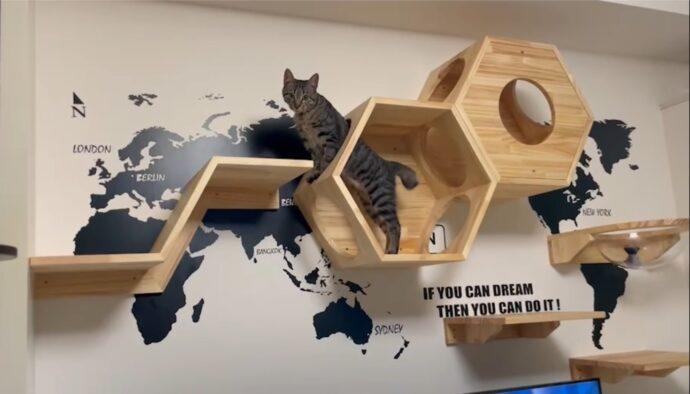 ▲「Am」在新家摸索環境,好像對林先生為牠親手釘上的貓跳台很滿意。(圖/新北動保處提供)