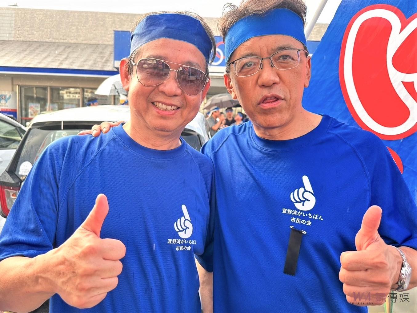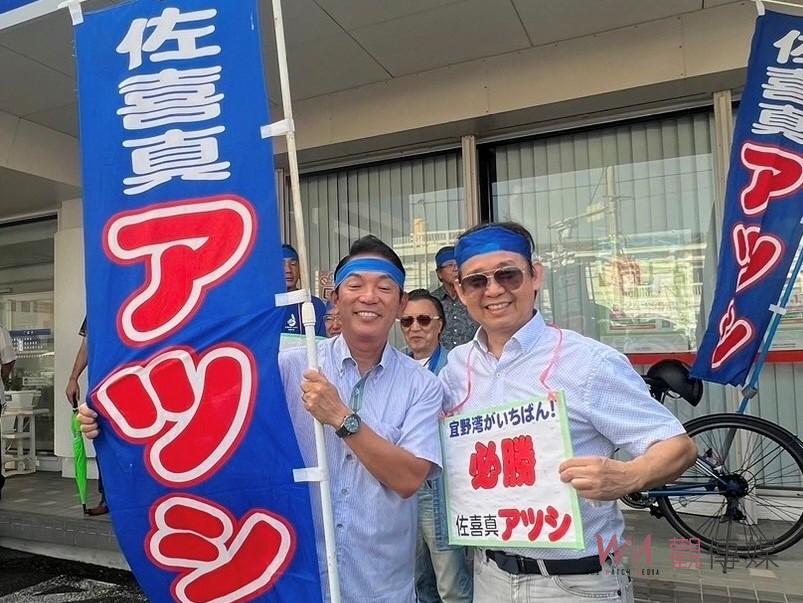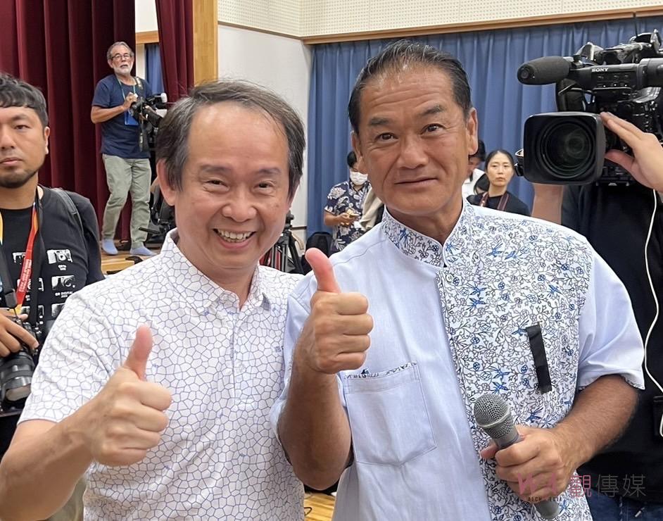 ▲王崇旭董事長與沖繩新任宜野灣市市長佐喜真先生(右)。