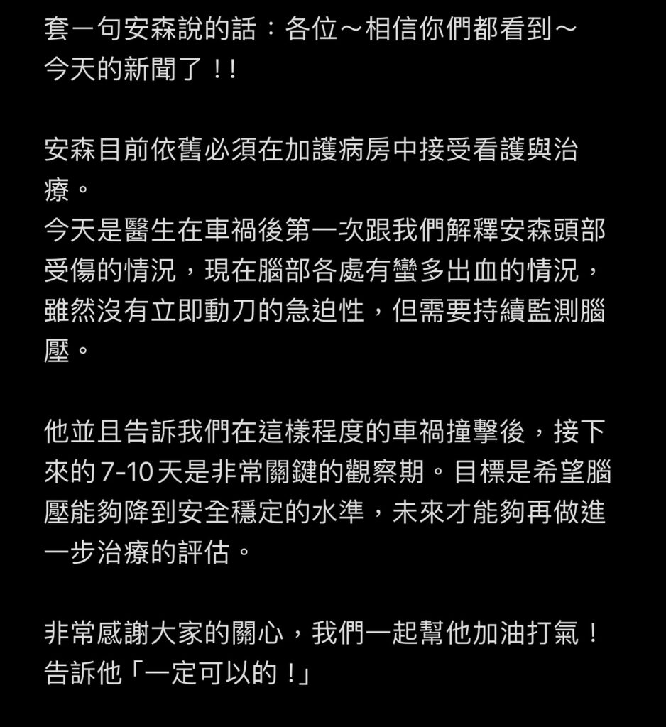 並透露醫生告訴她「在這樣程度的車禍撞擊後,接下來的7-10天是非常關鍵的觀察期。目標是希望腦壓能夠降到安全穩定的水準,未來才能夠再做進一步治療的評估。」。文末感謝眾人關心,網友也齊刷刷留言,祝福安森早日康復。
