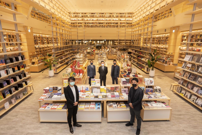 ▲林智堅市長搶先開箱蔦屋書店。左起為台灣蔦屋公司經理大塚一馬、大魯閣湳雅廣場總經理徐永昌、林智堅市長、大魯閣湳雅廣場總顧問許俊麒、台灣蔦屋公司總經理橋本龍之介。(圖/竹市府提供)