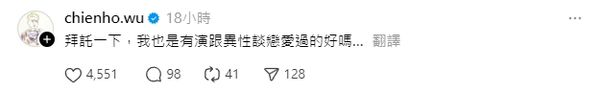 【記者爆料網 王傳文/綜合報導】演員巫建和在戲劇《愛愛內含光》中,與林哲熹飾演一對同志情侶,他的出色演技受到讚賞,甚至因此入圍金鐘獎最佳男配角。最近,他在社群上發文搭配自己的照片,表示:「沒事,只是想說發點什麼把形象拉回來一點。」也表示:「拜託一下,我也是有演跟異性談戀愛過的好嗎…」被指責在發言中過於在意自己形象,特別是在演出同志角色後的言論被網友認為不當。