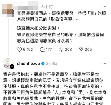 巫建和發文「拉形象」引發爭議。(圖/翻攝巫建和Threads)巫建和親自在該篇貼文底下回應:「實在是很抱歉,顧慮的不是很周全,這絕對不是本意。」,他解釋只是開玩笑,沒想過會造成誤會:「真的在意也不會接演,往後會更加注意的。」強調他接演劇本角色的考量主要基於劇本本身和角色吸引力,而非性傾向。最後他也再度致歉:「再次跟你說聲抱歉了,每個人都會有自己非常在意的事,藉此大家也有更多的提醒是好事,謝謝你啊,謝謝,一起繼續努力。」