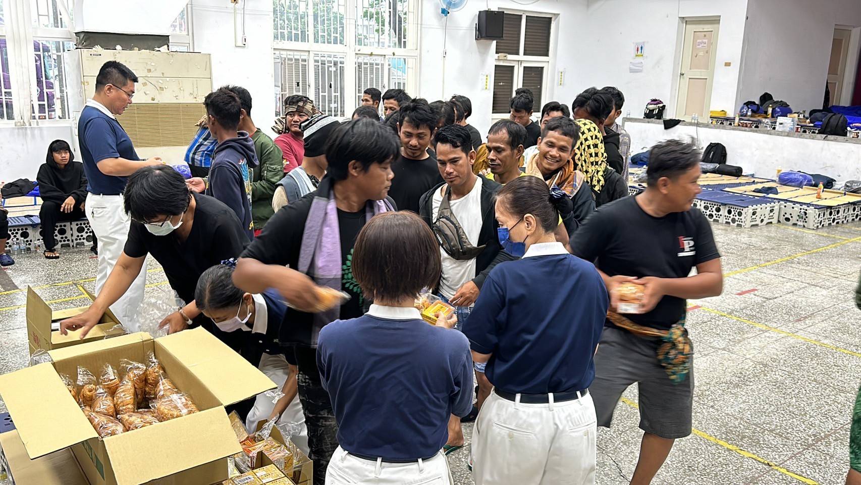 另在今10/3接獲梓官區長黃瑞財的通報,「智蚵活動中心內的移工缺乏早餐、立即由吳宗樺及橋頭和氣劉慧玲等志工,於早上八點冒著風雨去方師傅的麵包工廠載100個麵包與24箱飲料前往應急。