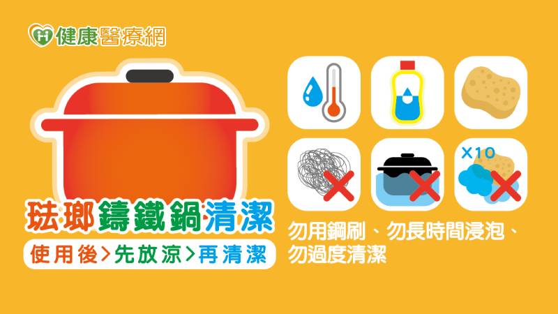 【健康醫療網/記者林怡亭報導】許多人喜愛的琺瑯鑄鐵鍋到底該如何保養呢?海洋大學食品科學系陳建利助理教授建議,初次使用鍋子時,可先裝清水並煮滾,待鍋子降溫後把水份倒掉並擦乾,藉此清除鍋具上的灰塵油污後,即可開始使用。