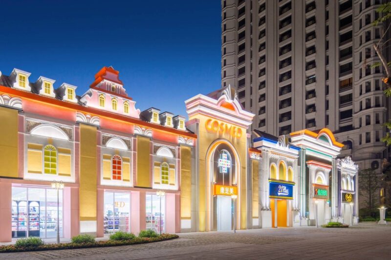 康是美延續店外風格,以優雅淡紫的古典窗花弧線,融入天空穹幕與環店裝飾,呼應玻璃櫃台雕飾流線,營造柔和高雅體驗。超過40個國際專櫃及醫美保養品牌,精選全球30大彩妝、香水品牌,結合彩妝師的免費試妝服務,優選知名生活品牌CANDO、日韓高端髮品與生活用品,並規劃保健專區與藥師駐店,加上聖德科斯生機飲食,同享生活中的健康與美麗。