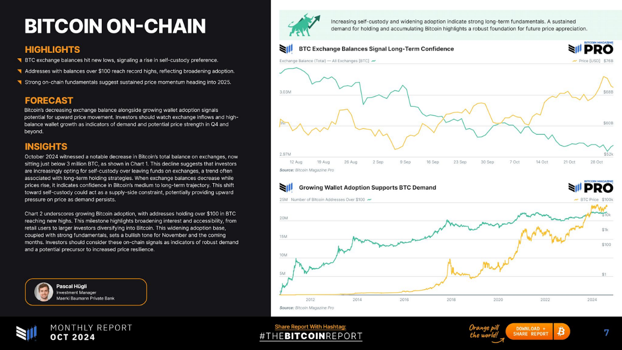10 月份比特幣在交易所的總餘額顯著減少,目前略低於 300 萬,如圖 1 所示。這種下降表明,投資者越來越多地選擇自我託管,而不是將資金留在交易所,這一趨勢通常與長期持有策略有關。當交易所餘額減少而價格上漲時,表示對比特幣的中長期走勢有信心。這種向自我託管的轉變可能會成為供應方面的限制因素,在需求持續的情況下,可能會對價格造成上行壓力。