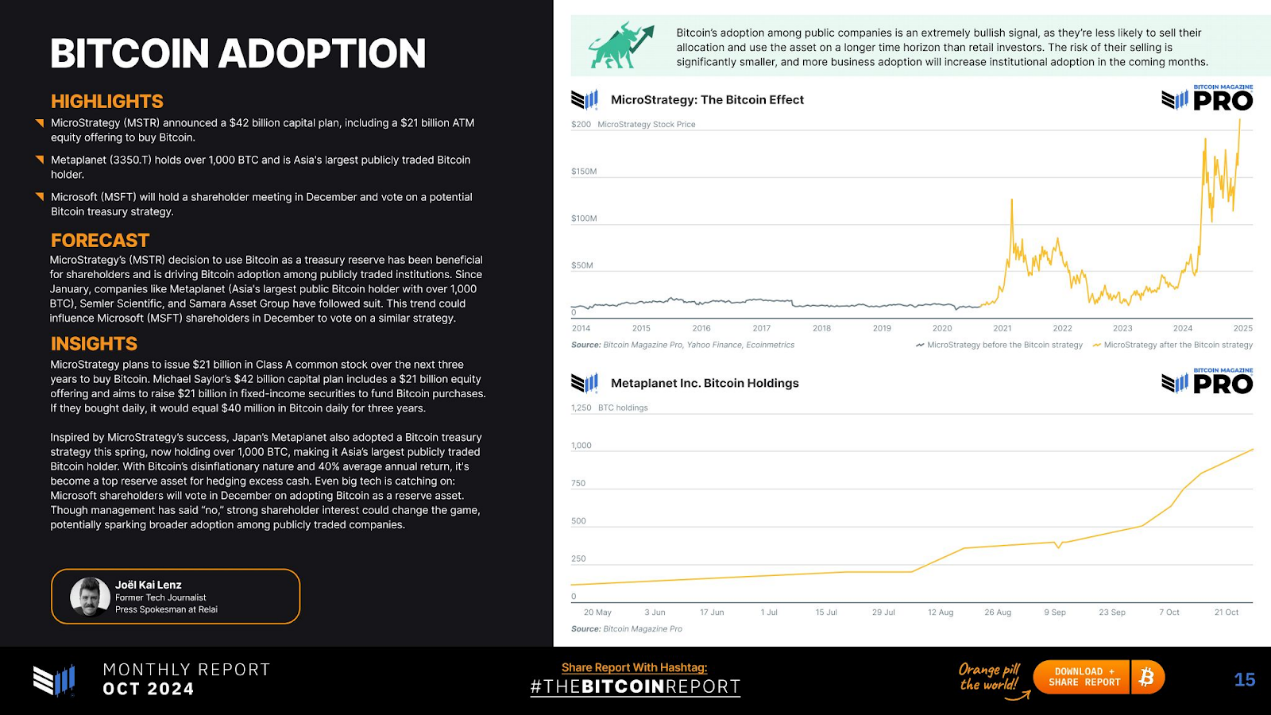 MicroStrategy (MSTR) 決定使用比特幣作為財務儲備,這對股東有利,並推動了比特幣在公開交易機構中的採用。自 1 月以來,Metaplanet(亞洲最大的公開比特幣持有者,持有超過 1.000BTC)、 Semler Scientific 和 Samara Asset Group 等公司紛紛效法。這一趨勢可能會影響微軟 (MSFT) 股東在 12 月就類似策略進行投票。
